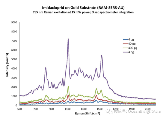 测试时的激光功率设置为15mW,积分时间设置为3s(图1)。金基底对吡虫啉浓度>4pg的效果最佳,这主要是因为金基底具有更强的背景信号,因此较低的浓度测量具有挑战性。