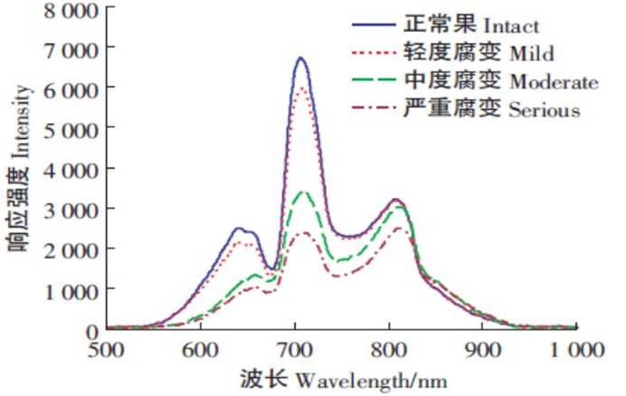 正常与不同腐变程度的苹果透射光谱比较图(可见+近红外)