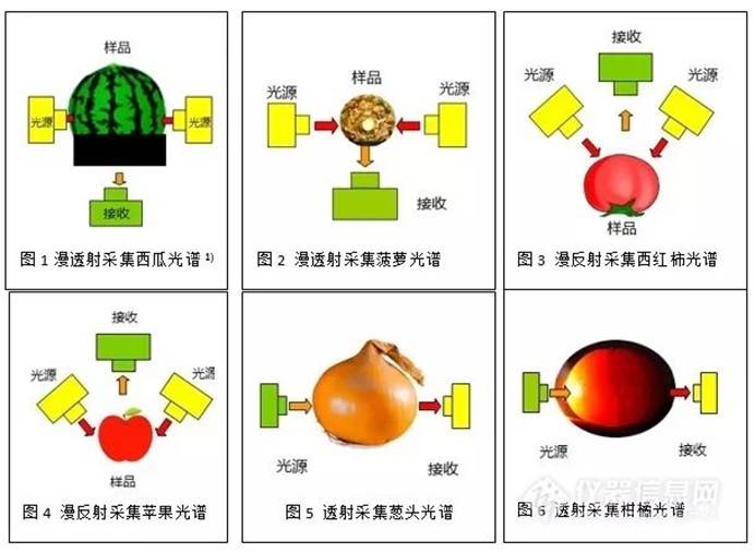 由于水果的尺寸大小、果肉薄厚,糖酸度高有低,且分布不均的情况,在光谱采集模块中有多种方式:(图片摘自仪器信息网)