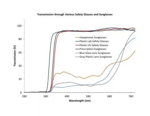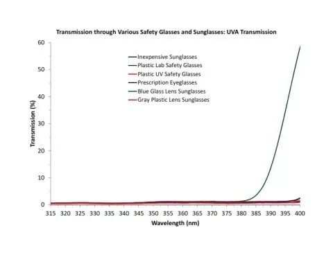 通过测试不同类型的镜片(玻璃或者塑料的,不同颜色涂层,有无偏振镀膜),太阳镜在UVB波段的透过率都非常低(~0.5%),见图2。UVA波段(~380nm)的透过率测量结果见图3,从图中看出,实验室普通防护镜在380nm之后的透过率逐渐提高,而太阳眼镜、化学防护镜等等则没有。
