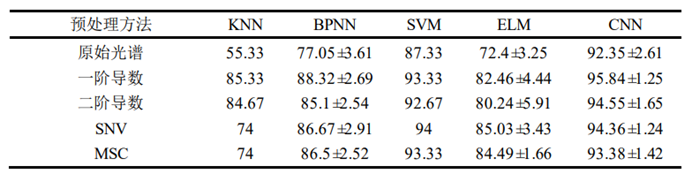 值得注意的是,不同的预处理方法对CNN模型的分类结果影响较小。这表明,与其他方法相比,用于开发NIR模型的CNN方法对预处理的依赖性较小。