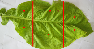 实验用海洋光学NIRQuest近红外光谱仪采集样本光谱,配件包含标准探头和漫反射白板,积分时间为5 ms,光谱范围为900-2500 nm,开机预热30 min,优化光谱仪扫描条件后进行近红外光谱扫描,扫描时每个样本在视线范围内避开主脉在左右两侧各取3个点扫描(见图1),所有点的平均值作为该烟叶的代表光谱。