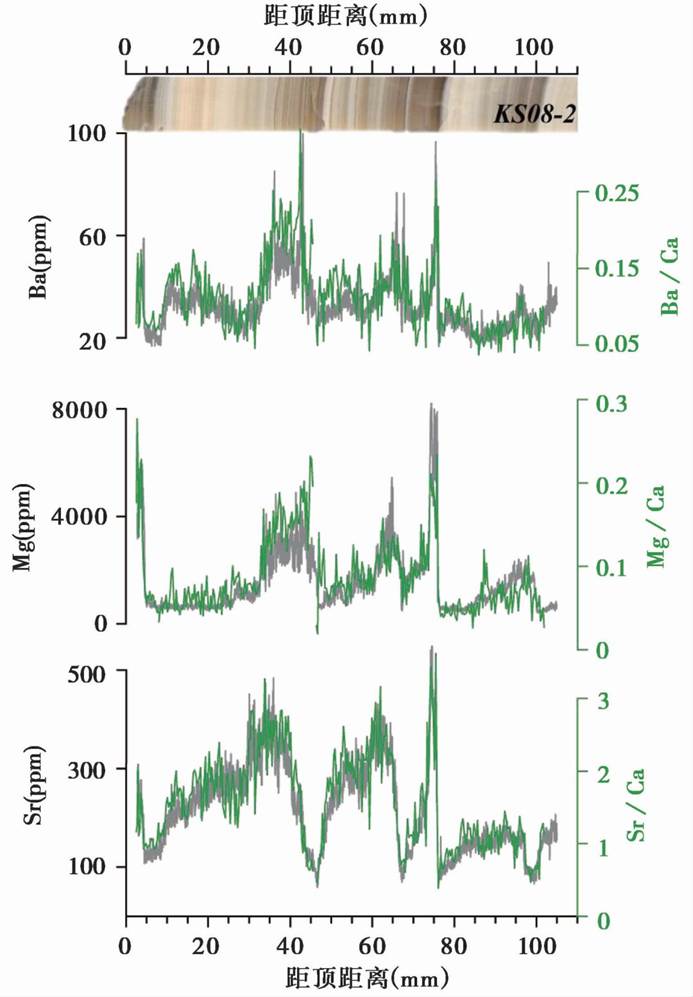 三组曲线从上至下依次为Ba元素、Mg元素和Sr元素的对比结果。绿色曲线代表LIBS结果,灰色曲线代表LA-ICP-MS结果。由上图可以看出LIBS测量结果Sr/Ca, Mg/Ca和Ba/Ca结果与LA-ICP-MS有良好的重复性。
