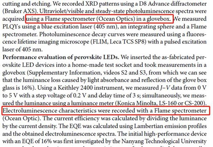 研究人员在对LED材料性能进行表征时,使用海洋光学Flame系列微型光纤光谱仪在手套箱环境进行测试,获取其电致发光/光致发光谱图及外量子效率。