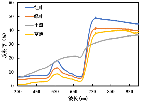 图为使用FS1100测试红叶、绿叶、土壤及草地的测试结果