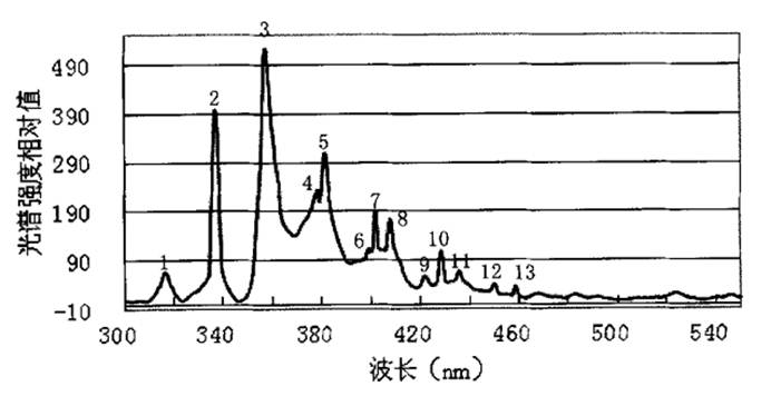 等离子体监测可为样品提供详细元素分析,并确定在控制基于等离子体的过程中所需的关键等离子体参数。等离子体发射特征谱线可用于识别存在的元素,强度可用于实时量化粒子和电子密度。图1为空气300-550nm光谱曲线图,在该波段内,N的特征谱线有1、2、3、5、7、13;O的特征谱线有4、11;Xe的特征谱线有6、8、9、10。