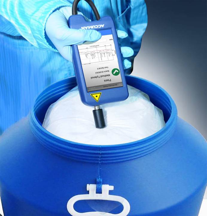 ACCUMAN PR-500采用拉曼光谱快检技术,这一基于激光和光谱学的分析技术,被称为“分子指纹”,可以透过透明包装,直接在仓库,投料间等区域对原辅料进行无损检测。对于困扰红外的水溶液检测,也可以轻松应对。