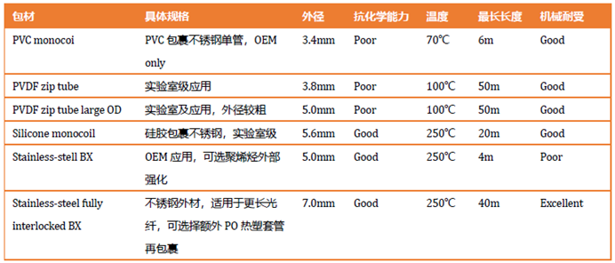 外包材对光纤主要起保护作用,在实际应用中,我们需要根据不同的测试环境来选择不同的光纤外包材料。海洋光学光纤外包材有硅胶、PVC、不锈钢等材质可定制选择。