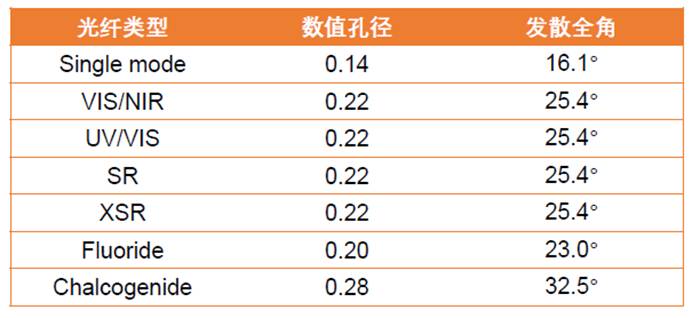 海洋光学大多数光纤的数值孔径NA都为0.22(如下表所示),若光纤处于真空或空气中,光纤的发散半角即全反射角为αmax=12.7°(全角大约25.4°)。