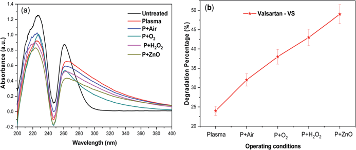 图2.(a)等离子体处理的缬沙坦药物的紫外-可见光谱和 (b)在不同环境条件条件下的降解率。