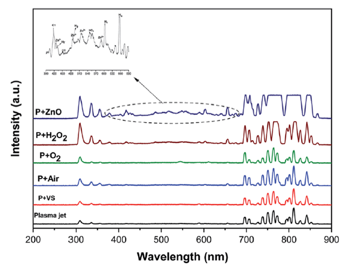 相比于单独的等离子体、空气、O2和H2O2等不同环境条件,光谱分析证实等离子体与ZnO形成了更高浓度的活性物质,含有ZnO纳米颗粒的缬沙坦水溶液表现出更高的降解率。